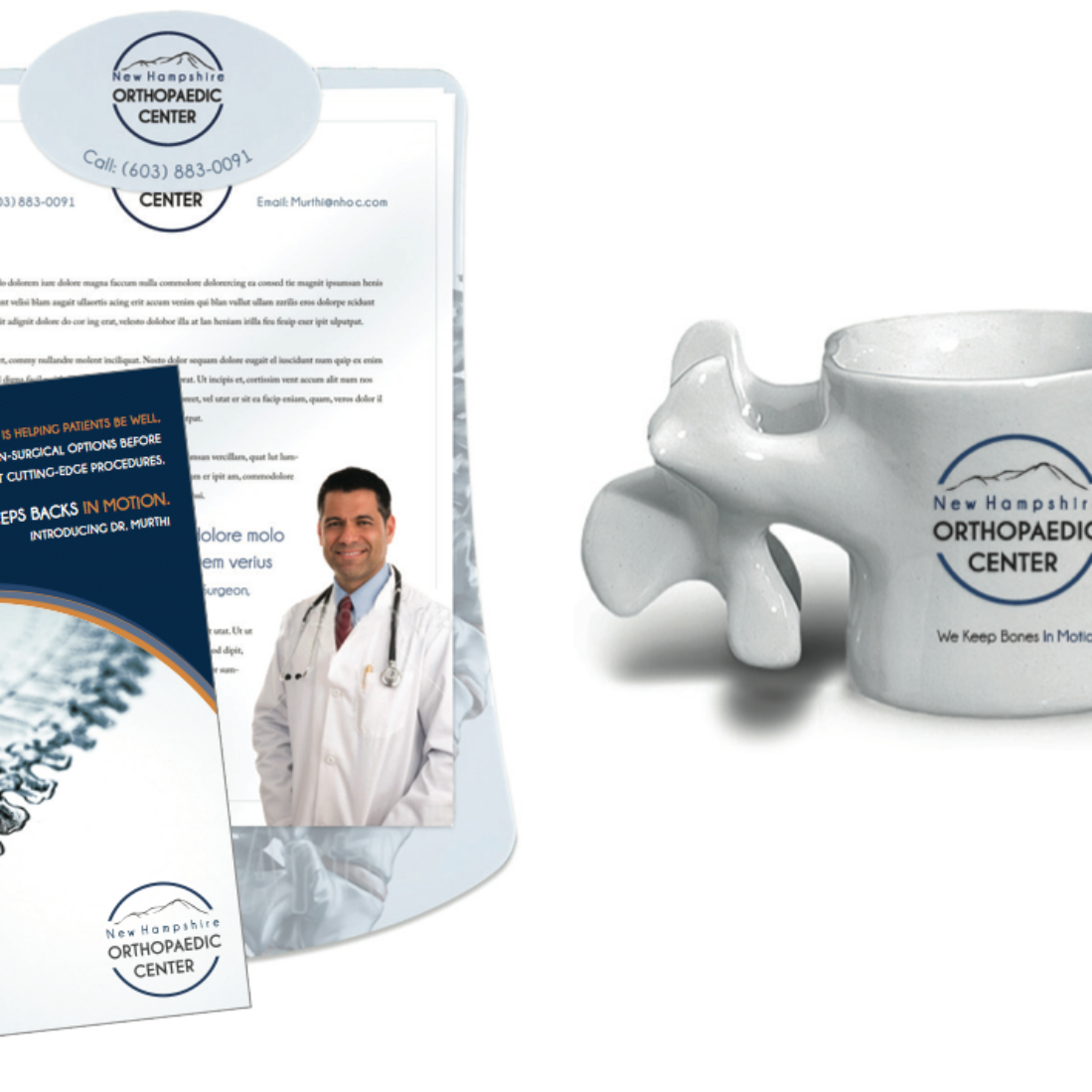 - Direct mail campaign focused on spinal care that included specified brochure, mugs, clipboards (with cover page), packaged in a custom box targeting physicians in the industry to refer patients to a specialist spine surgeon at NHOC.