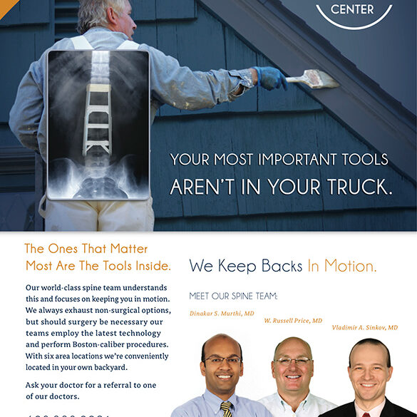 - Created a year-long print ad campaign called, “Your tools inside,” focusing each month on a different team within the facility. We designed, integrated, and initiated advertisements that promoted each service at different times of the year. Winter had a focus on knees (skiing), spring focused on shoulders (tennis), summer showcased ankles (golf), and fall was all about the spine (painting – manual labor).